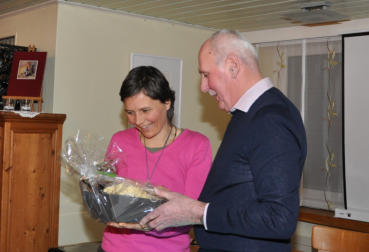 Präsident Urs Dörig Dirigentin Angela Palfrader ein kleines Präsent.